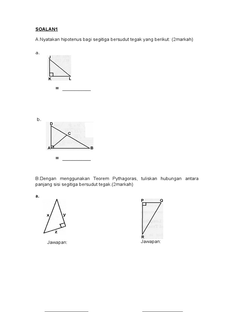 1 Panjang dan lebar segi empat sama mempunyai nilai yang sama. Berdasarkan segi tiga tegak KLM yang manakah sisi yang bertentangan dengan.